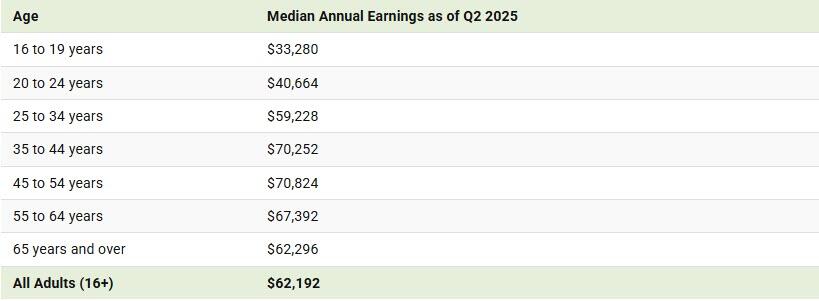 아래 데이터 표에서 볼 수 있듯이, 미국에서 가장 젊은 근로자(16세~19세)의 연봉은 33,280달러에 불과하여 가장 낮습니다. 이 수치는 전국 중위 연봉의 거의 절반에 달하는데, 이는 이들의 경력이 부족하고 급여가 낮은 신입직을 고려한 결과입니다.