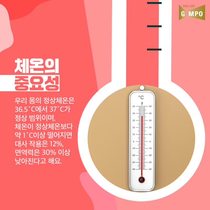 우리 몸의 정상체온은 36.5˚C에서 37˚C 일 때가 정상 범위이며, 신체 온도가 0.5˚C만 떨어지게 되더라도 몸에 이상 징후가 나타나기 시작합니다. 또한 체온이 정상체온보다 약 1˚C 이상 떨어지면 대사 작용은 12%, 면역력은 30% 이상 낮아진다고 하니 겨울 건강을 위해 꼭 체크해 봐야겠죠?