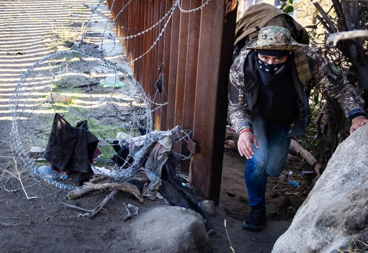 A masked migrant illegally crosses into the United States outside of San Diego, Calif., on Dec. 5, 2023. John Fredricks/The Epoch Times