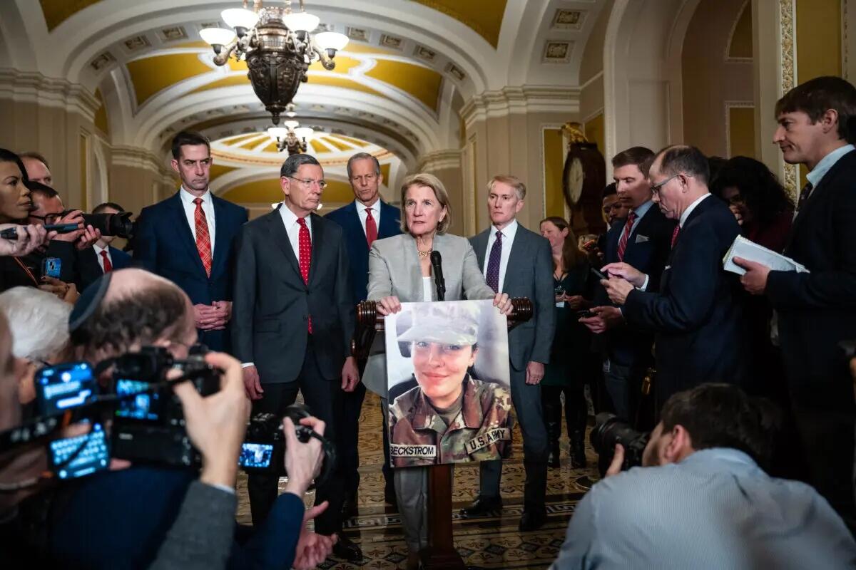 Sen. Shelley Moore Capito (R-W.Va.) holds a photo of Army Spc. Sarah Beckstrom, a West Virginia National Guard member who was shot near the White House on Nov. 26, in Washington on Dec. 2, 2025. Madalina Kilroy/The Epoch Times