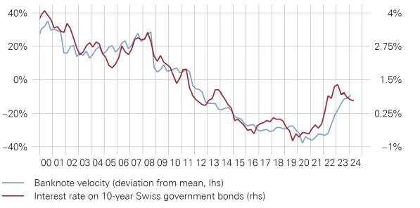 실제로 스위스에서는 금리가 하락함에 따라 고액권 지폐의 유통 속도가 감소했다가 최근 금리가 상승하면서 다시 증가하는 현상이 관찰되었습니다.