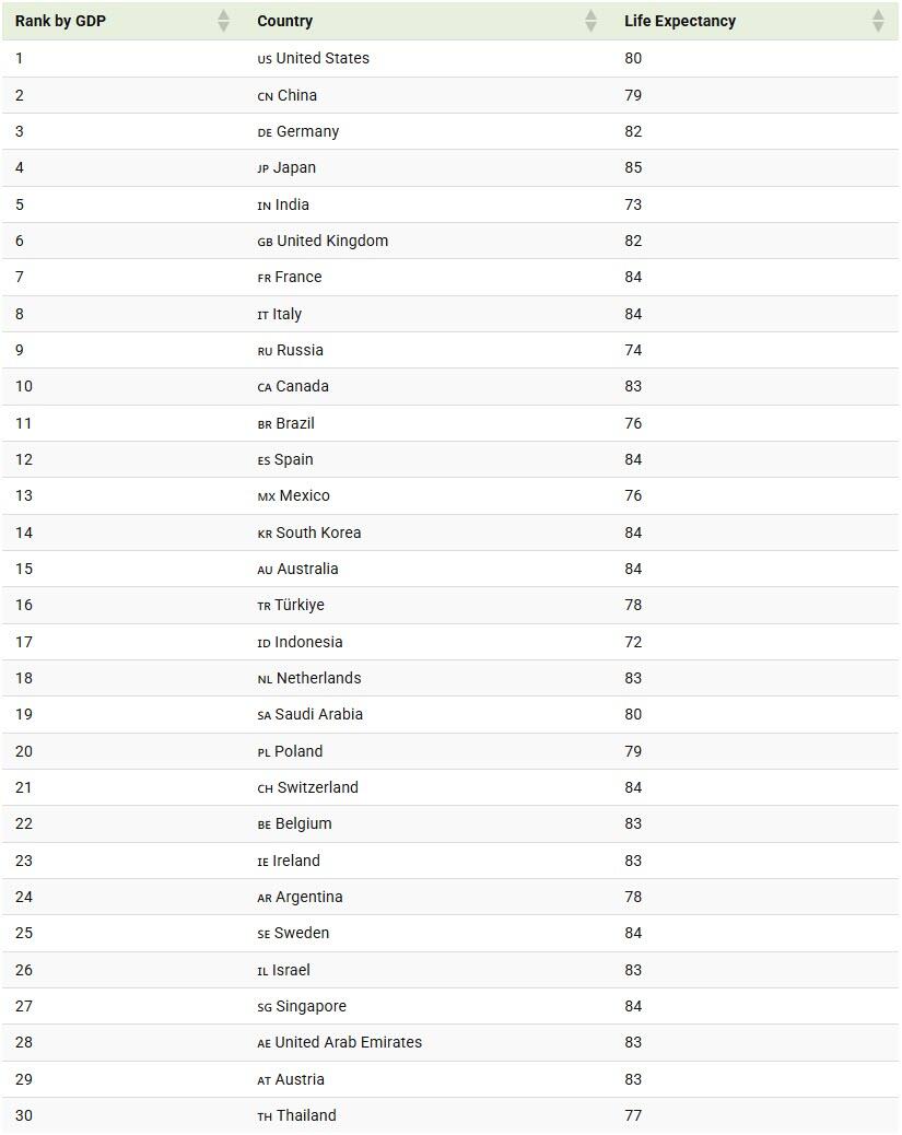 아래에서는 2025년 GDP를 기준으로 국가 순위를 매기고, 각국의 출생 시 기대 수명을 함께 제시합니다.